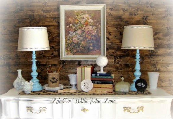 The buffet got a new look as well since Valentine's Day is over. Milk glass, vintage books, and a few other things.